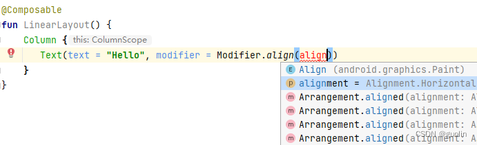 比如说,这里我们使用Column实现一个纵向排列布局,当想要为子元素指定对齐方式时,你会发现Modifier.align()的参数类型自动变成了Aliangment.Horizontal,说明只可以在水平方向上指定对齐方式。