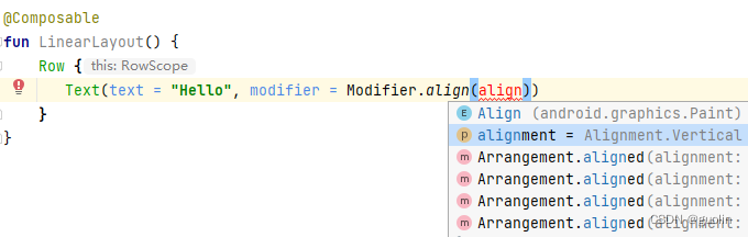 而如果我们使用Row把布局改成横向排列模式,你会发现,子元素的Modifier.align()的参数类型自动变成了Aliangment.Vertical,说明只可以在垂直方向上指定对齐方式。