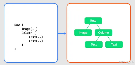Composition这一步其实就是我们平时写的各种Composable函数,用于告知Compose我们想要编写出一个怎样的界面,最终会构建成一棵UI树(见下图)。对应到View系统中,那就是编写XML这部分。